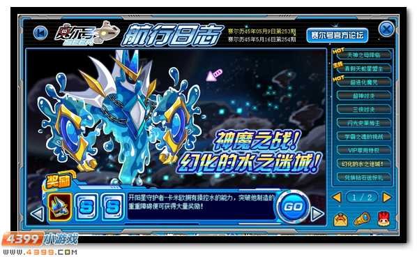 赛尔号卡米欧在哪?赛尔号卡米欧怎么抓?卡米欧是水系精灵,单一的系别精灵,不知道实力如何哦?想知道赛尔号卡米欧怎么得?那快来看看赛尔号卡米欧在哪怎么抓详细攻略吧! 精灵资料:赛尔号卡米 卡米欧进化图种族值技能表 >>> 点击左上角的航线日志,选择“幻化的水之迷城”,再点击右下角的“GO”按钮,传送到活动场地。