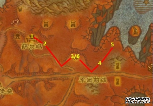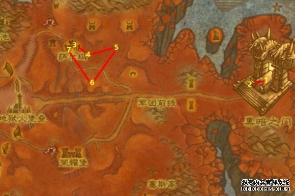 地点 诅咒之地 接取任务 [1-1]穿越黑暗之门 勇士穿过黑暗之门吧!任务将从这里正式开始 01.穿过黑暗之门 走下楼梯寻找沃雷恩中将交付任务: [1-1]穿越黑暗之门任务 获取任务: [1-2]抵达外域 02.走到鸟点处,与飞行管理员维拉加·乱羽交谈,交付任务: [1-2]抵达外域 获取任务: [1-3]萨尔玛之旅 此处通过鸟点直接飞往萨尔玛即可 03.到达萨尔玛,找克拉库克将军(下鸟点不远处就能看见)交付: [1-3]萨尔玛之旅 获取任务: [1-4]向纳兹格雷尔将军报道 进入到一旁的大厅,找到纳兹格雷尔交付: [1-4]向纳兹格雷尔将军报道 获取任务: [1-5]消灭燃烧军团 在纳兹格雷尔的对面获取: [1-6]噬骨之血 出大厅,在萨尔玛城镇中,找到一名地精(泽格·纳克布斯)接取: [1-7]我为部落工作 出门前炉石定在萨尔玛! 那么你现在拥有的任务有: [1-5][1-6][1-7] 04.出门之后往东走,到达补给车队(X58,Y41出门左拐,不远就能看见NPC:斯古尔·碎颅者中士)交付任务: [1-5]消灭燃烧军团 获取后续任务: [1-8]魔火峡谷 05.继续往东(X60,Y37附近),杀死6个地狱火战争使者、4个唤火小鬼、1个恐惧召唤者,完成《魔火峡谷》任务,完成后不要急着交任务 06.上马往西南方向(X59,Y46)走先做“噬骨之血”和“我为部落工作”两个任务 到达后杀所有带着噬骨名称的兽人即可获得噬骨之血,打到12个完成任务; 同时在他们营地的周围散落着“回收的金属”和“回收的木材”,各收集8个完成《我为部落工作》 07.两个任务都完成后返回萨尔玛 第二阶段
