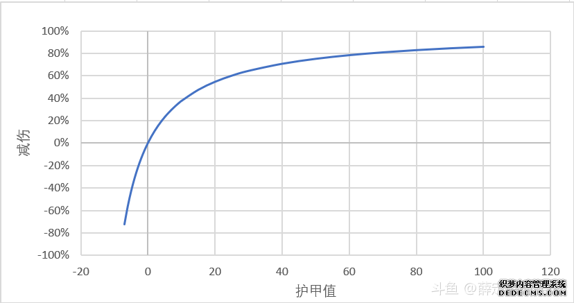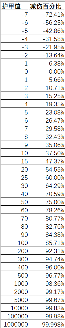 根据百度百科可以轻松查到,在魔兽争霸中 护甲减伤 = 护甲 × 0.06 / (1 + 0.06 × 护甲) 网上流传的所谓1点护甲等效6%的减伤就是根据 0.06 这个常数来的,实际上这么说是错误的。带入不同护甲值,计算对应的减伤,可以得到下表。打开魔兽游戏,看各种单位的护甲值和减伤值,很容易验证该公式的正确性。 曲线图可以更好地看出趋势。可以看出这种公式的设计就是为了让减伤效果向100%收敛时越来越慢。当护甲为无穷大时,分子分母为同阶无穷大,因此减伤值为100%。 特意计算了负护甲值,可以看出与叠护甲收益越来越低相反,叠减甲的收益越来越高。但此处存疑,假如腐球+3级酸性炸弹+精灵火能叠到-13护甲,对于0防怪代入公式能得到355%增伤,高得吓人。如果有其他手段能叠到-16.66··护甲,分母将为0,增伤值为无穷大。所以我怀疑负的护甲有另一套计算公式。有熟悉word editor的朋友可以说明指正。 需要说明的是,这仅仅是数学计算,到计算机实现上会有差异。比如数学函数是连续的,计算机不是,计算机可能采用近似值。有熟悉word editor的朋友可以说明指正。 (责任编辑:admin666) |