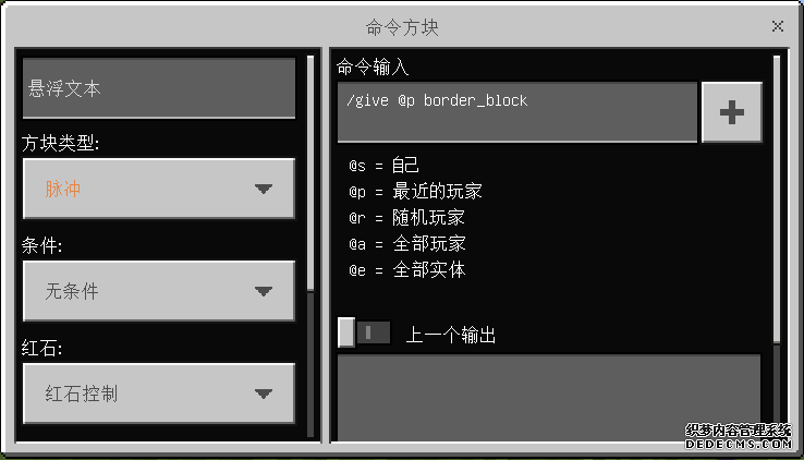 在命令方块中输入 /give @p border_block 方块类型设置为脉冲 条件为无条件 红石设为红石控制