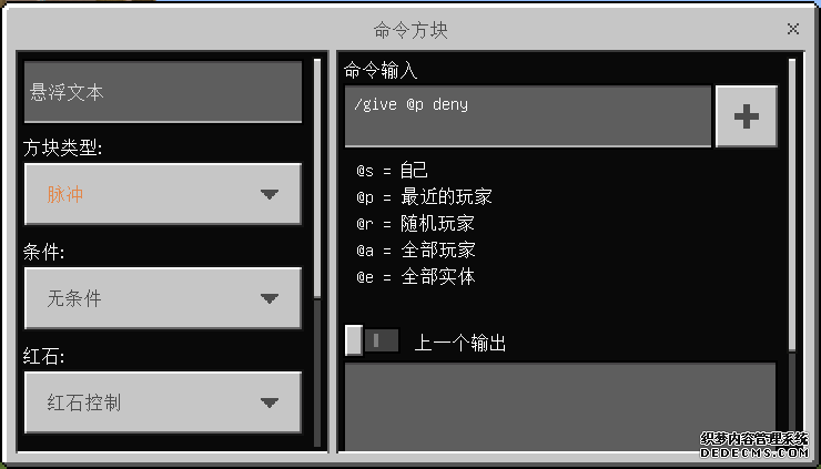 在命令方块中输入 /give @p deny 方块类型设置为脉冲 条件为无条件 红石设为红石控制