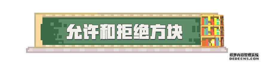 按下按钮后得到允许或拒绝方块 这两个方块为教育版和基岩版独有 当被放置时,允许方块会允许没有权限 或冒险模式的冒险家 在它们上方放置或者摧毁方块 而拒绝方块会拒绝冒险家 在它们上方放置或者摧毁方块