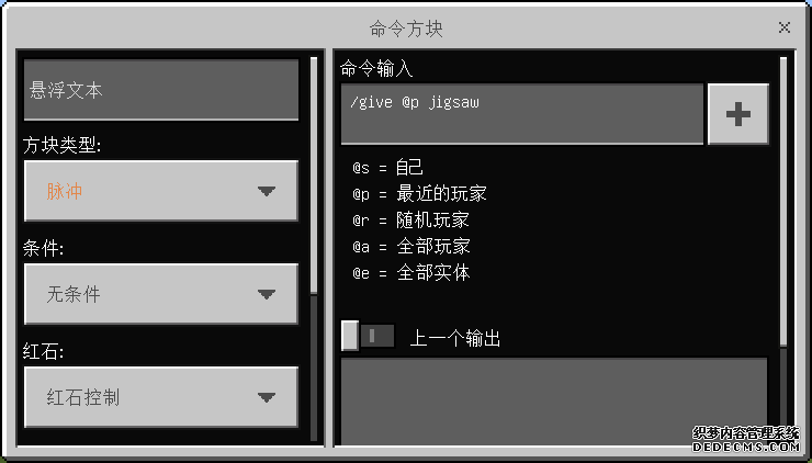 按下按钮后得到线锯方块 线锯方块又称作拼图方块 它是一种允许游戏使用较小模板 生成结构的拼接方块 目前能生成掠夺者前哨站、村庄、堡垒遗迹等