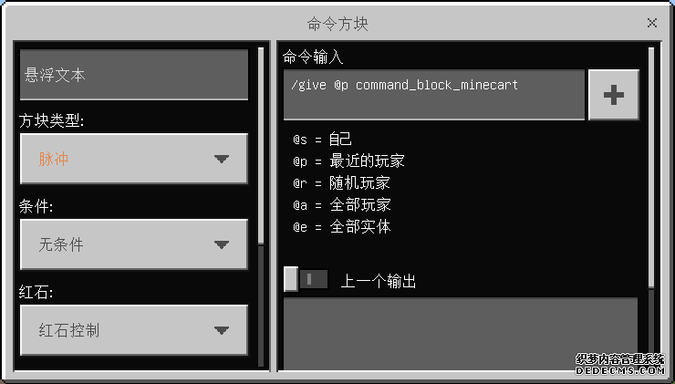 按下按钮后得到命令方块矿车 它结合了矿车和命令方块的功能 当其在激活铁轨上运行时 它会反复执行命令 当它经过被红石比较器连接的探测铁轨时 会输出命令方块的结果