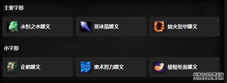 大型雕文: 永恒之水雕文- 水元素无限期持续,但是不再释放冰冻。 寒冰箭雕文 -寒冰箭造成的伤害增加5%,但是会移除减速。 熔火盔甲雕文-提供额外 20% 的精神作为暴击等级。 小型雕文: 奥术智力雕文- 这将你的 奥术光辉和奥术智力的法力消耗减少一半。 缓落雕文- 缓落法术不再需要试剂。 企鹅雕文-将变形术绵羊改成企鹅。 火法 天赋