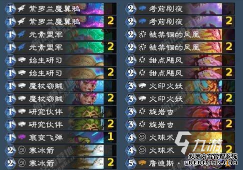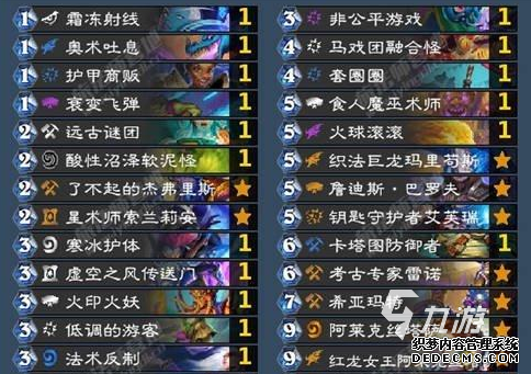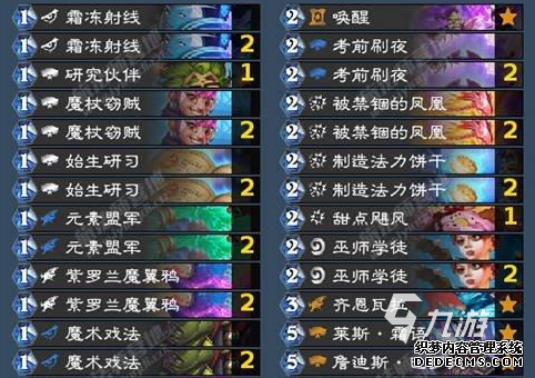 3、奇迹法 目前版本的奇迹法可以说是法强法的中速补强版,和法强法不同的是,奇迹法有更合理的元素衔接可以更稳定的触发元素盟军来过牌,还有唤醒和法力飓风来增加卡组资源,中期更是可以通过法术配合法力巨人或是奇恩瓦拉的超展开来给对手压力。