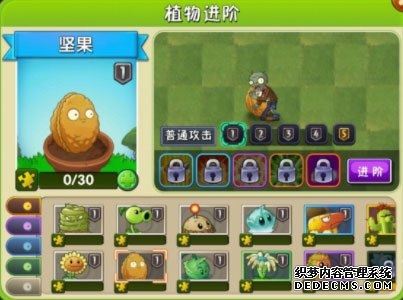 3、坚果,坚果可以抵御僵尸,有着高防御性,种植要50阳光,技能效果为披上铁盔甲,抵挡更多的伤害。