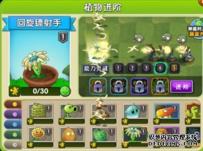 7、回旋镖射手,向前发射回旋镖对僵尸造成伤害,种植需要175阳光,技能效果为向前方和左右发射大量回旋镖造成伤害。