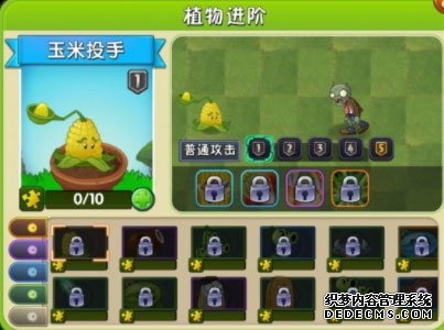 11、玉米投手,向前方僵尸投出玉米粒造成伤害或者投出可以定住僵尸的黄油,种植需要花费100阳光,技能效果为抛出大量黄油对僵尸造成伤害并且定身。