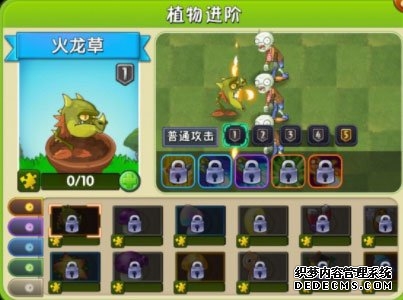 12、火龙草,向自身前方6格身位喷出火焰造成伤害,花费150阳光,技能效果为向前方喷出能摧毁目标的火焰柱。