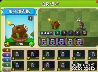 14、椰子加农炮,需要点击向前方开炮对僵尸造成范围伤害,种植需要400阳光,技能效果为发射一颗延迟爆炸的炮弹并击退僵尸。