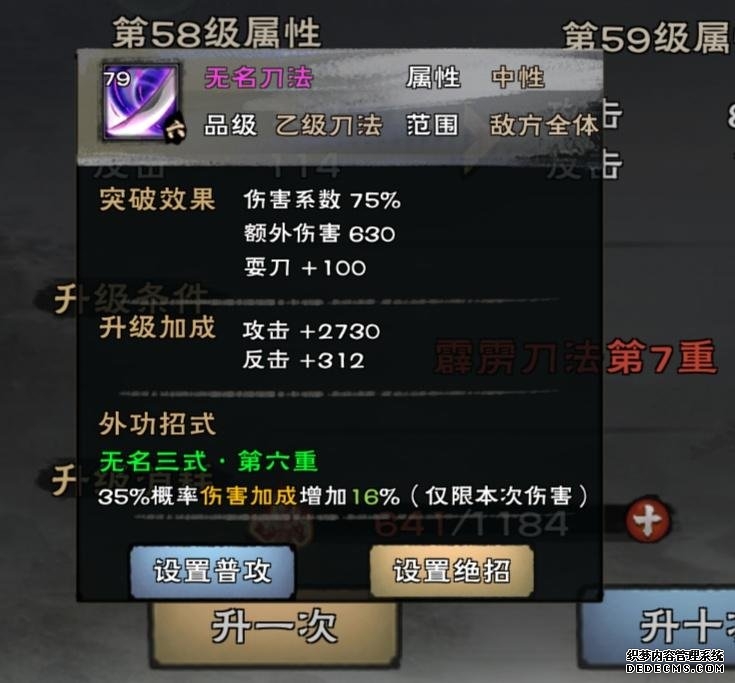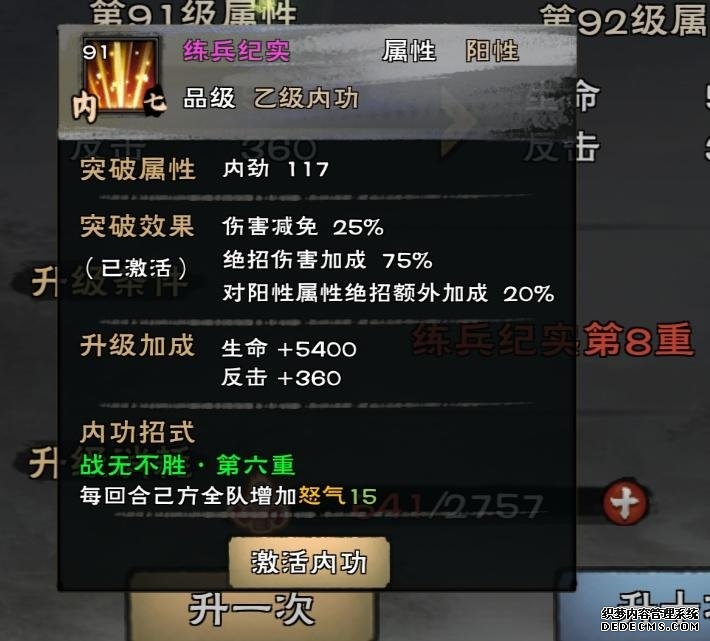 对于第一次门派进阶,如果你有6级金色防御感悟,那你就完全可以闭眼过了,因为对于第一次门派进阶6级金色防御,敌人根本破不了防,印象中只能打出百位伤害(打的太久了,记不太清了。)只要输出能破防敌人,闭眼过。 如果没有6级金色防御,也没关系,拥有5级金色防御,和足够的孙思邈奶量,一样可以闭眼过。前提也是输出能打的动敌人 如果以上都没有,你走的是均衡发展的路线,这个我没尝试,可以根据我的路线先发展防御,就可以比较轻松的过了。后期可以再把其他发展回来。不影响。 (这个是我自己过第一次门派进阶的方法,方法肯定很多,所以这个仅供参考,不是必须这样才能过。) 2、第二轮门派进阶 对于第二轮门派进阶跟第一轮门派进阶就完全不同了,总结也是三点:两套无名+先手身法+起手满怒(戚继光)。 两套无名,起手满怒,先手攻击,基本全秒。就是下边这几样东西。
