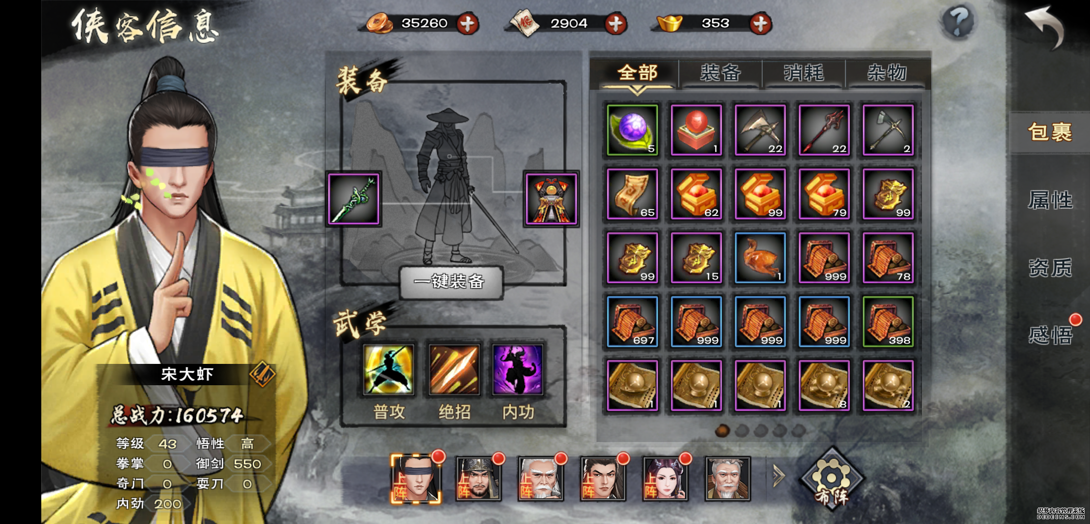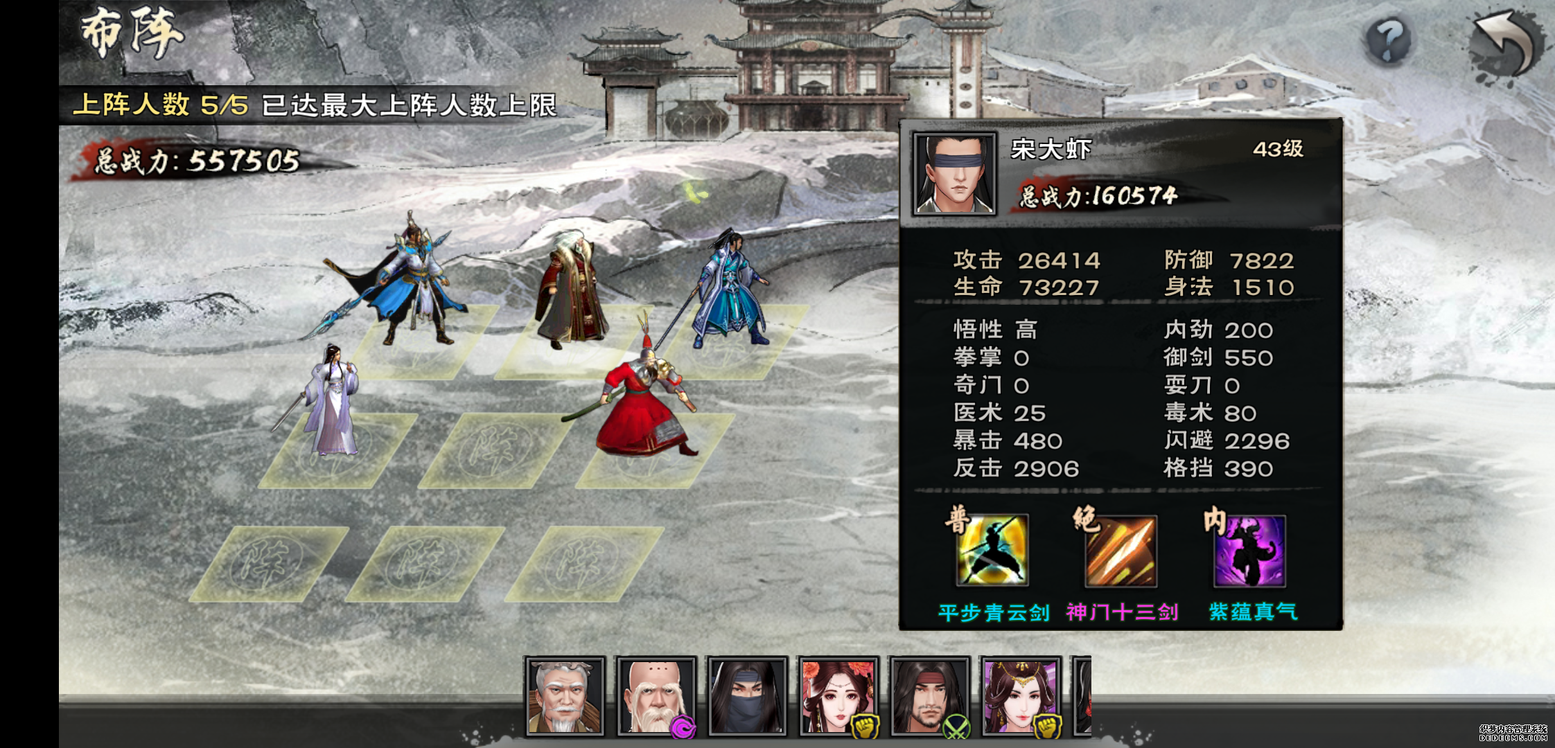 (如果使用本方法依然打不死boss,说明输出不够,可以适当发展输出,或者参考本篇攻略发展篇。) 2、调整武功,调整站位,调整感悟。 在本游戏,点击敌人不会直接开始战斗,可以先观察敌人站位以及技能,调整自己的站位以及技能感悟,来实现针对这一波敌人达到最小损耗,最大输出。这个技巧实际操作起来,会比较恶心。 因为如果针对每一波敌人调整站位还好,但是每次都调整武功和感悟,说实话很麻烦。但对于差一丢丢就可以通过门派进阶的人来说,这个也是一种可行的方法。 本方法细节技巧:如果要把后排当T,需要把防御感悟给他,输出感悟换到新后排,等等就不赘述了。 武功招式前排最好加闪避,可能会奇迹的发生闪避一轮伤害,这是很强的。(当然这只是一种思路,找到适合自己的就好。) 站位就依据敌人职业来克制站就可以了。 二、发展篇 1、第一轮门派进阶 如何通过第一轮门派进阶?对于第一轮门派进阶有两点需要注意:防御感悟和孙思邈奶量。就是下边俩东西