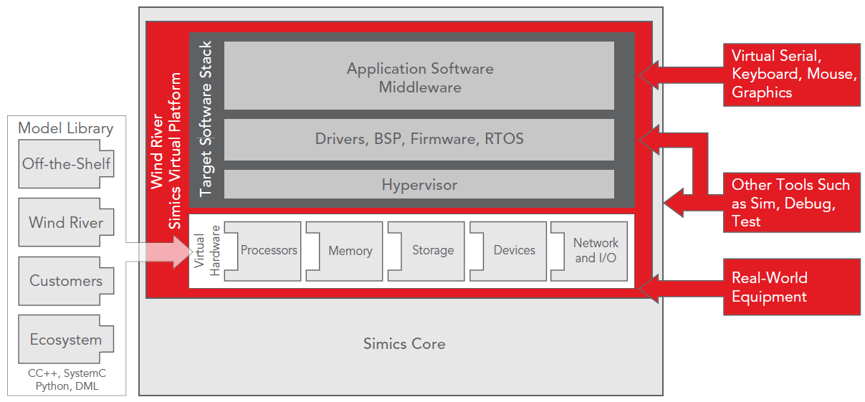 风河Simics全系统模拟工具 概述 近年来电子系统已经越变越复杂,大多使用异构多处理器和多核处理器来运行多个软件栈和操作系统,有时这些系统还会作为大型系统的一部分,通过总线、背板、局域网或因特网进行互联。由于系统日益复杂且对系统间互联的要求不断提高,传统的开发工具和流程在面对这些系统的调试、集成和测试时显得力不从心。风河Simics帮助开发人员从根本上提高了系统开发、调试和测试的效率,从而大大改善了包括产品上市时间、成本、产品质量在内的几个重要业务指标。 模拟完整的系统 风河Simics是一个全系统模拟工具,为软件开发人员把整个目标硬件平台模拟出来。无论该硬件是一个独立处理器还是一个大型的、复杂的、互联的电子系统,均可通过一个虚拟平台模拟目标硬件的各种功能操作,使得未经修改的目标软件(BSP,固件,实时操作系统,中间件和应用程序)完全以真实硬件平台上运行的方式在虚拟平台上运行。
