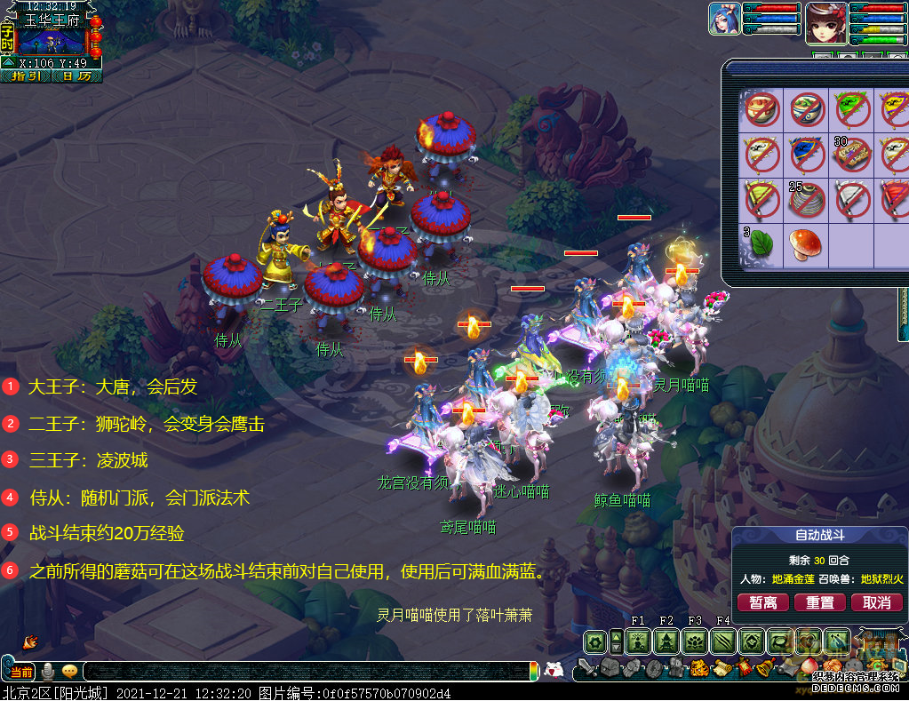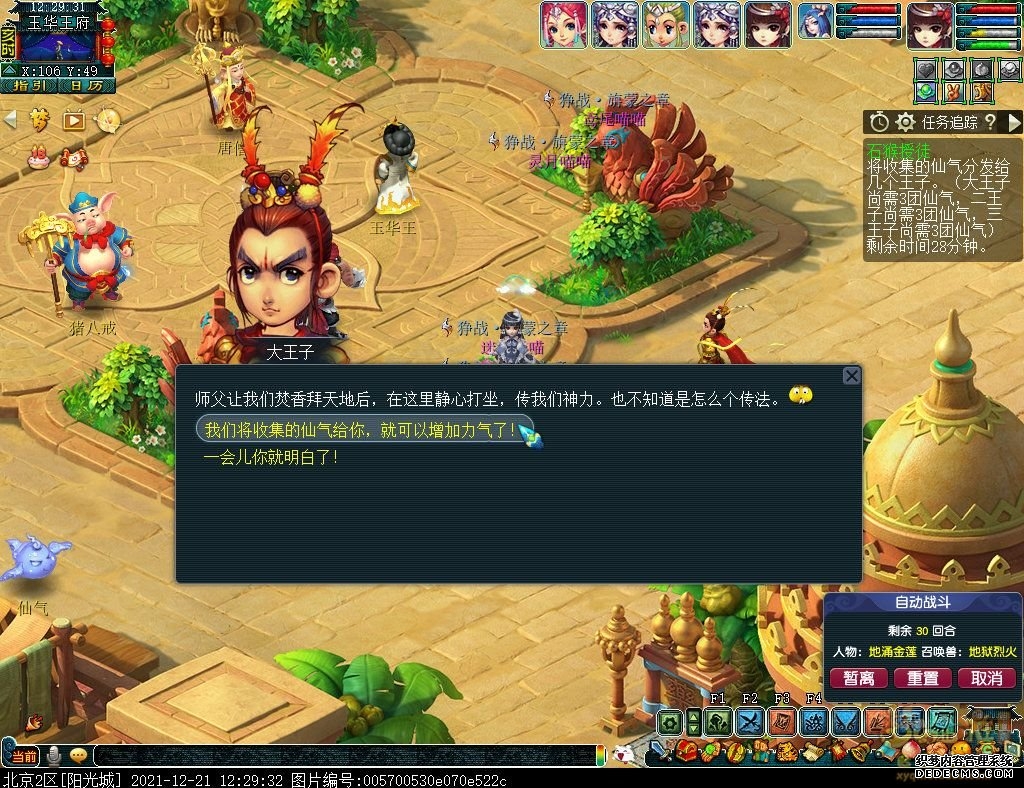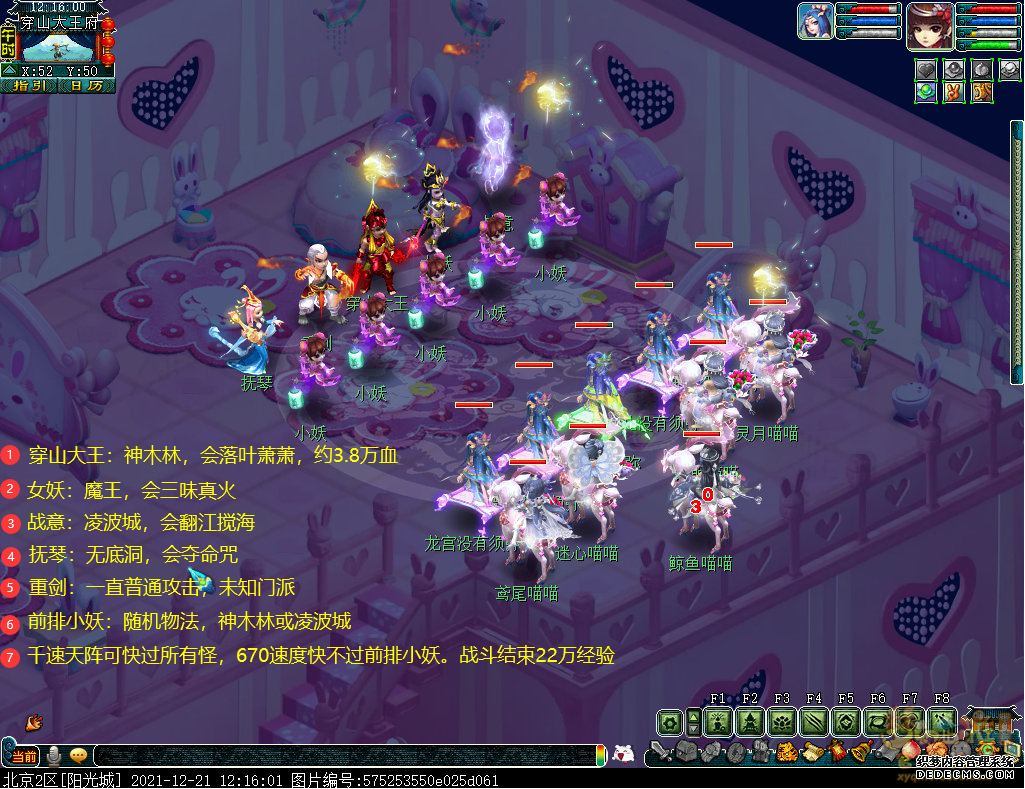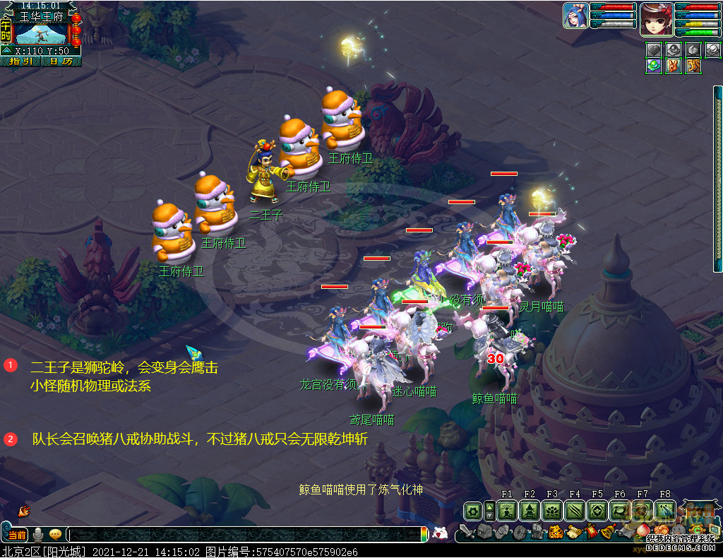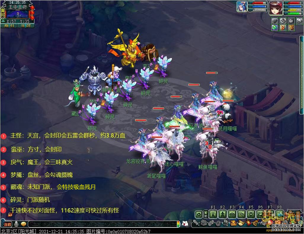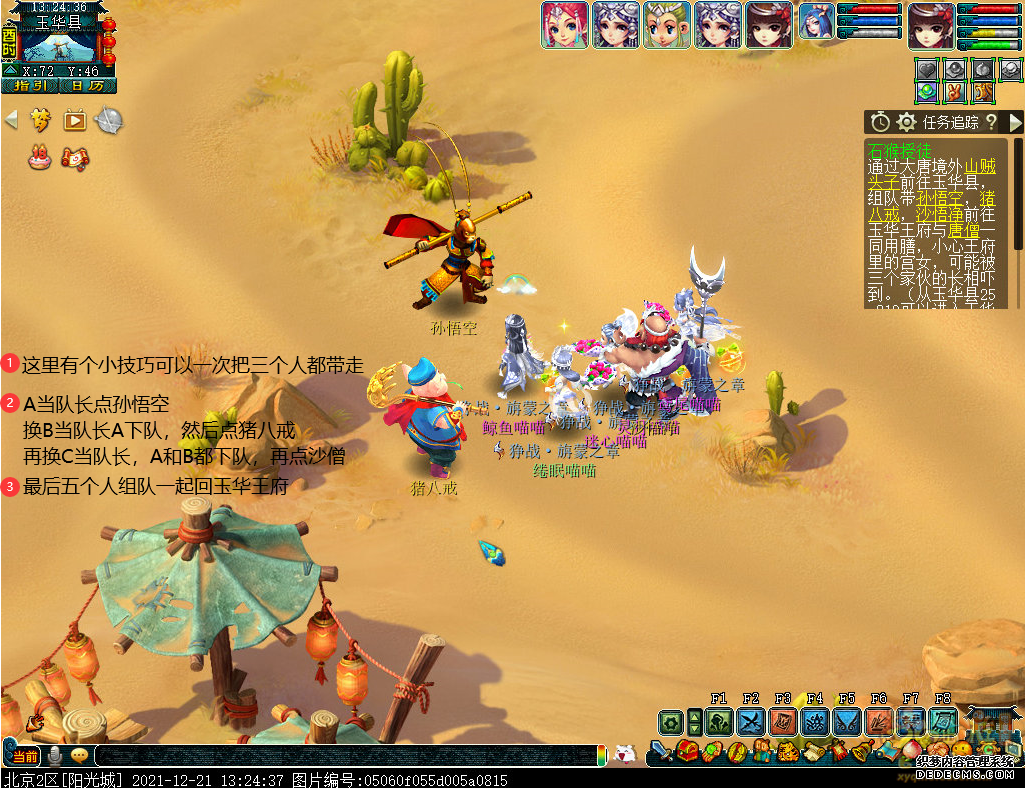 [h2]副本简介[/h2] 唐僧师徒一行来到玉华县,唐僧进宫与玉华王相谈甚欢,玉华王宣与唐僧师徒4人一起用斋,之后却麻烦不断。 我们需要前去玉华县,帮助唐僧师徒几人解决麻烦。悟空、八戒、沙僧三人顺利将玉华王的三个儿子收为徒弟,传授一身本事。 ![]() 副本说明: 1、此副本为双支线,开启后随机进入其中一条支线。任务时间为120分钟。 2、等级限制:≥60级 3、人数要求:5人 4、战斗死亡为正常死亡。 [h2]测试队伍[/h2] ![]() [h2]开启副本[/h2] ![]() 可以组好队在长安城(150,184)处找副本官员直接开启副本,创建成功后可以立即传送到副本场景。 进入后随机触发一条支线: [h2]支线一[/h2] ![]() 安抚受惊的王子后,进入地洞里找线索营救玉华王。 图上5个标识为5个传送门,点击传送门可随机传送到其他4个传送门外,方便更快捷地找线索。 ![]() ![]() 找到线索人的时候,需要与之一战,进入战斗只有两个怪,战斗胜利获得线索口令。 需要注意:所有NPC不止是只能找一次,获得线索和上交都会刷新NPC,所以可以同一个NPC再找第二次试一下。 ![]() 得到线索口令后,找到对应机关给予正确口令即可完成,可选择获得5个线索再交,也可选择获得一个交一个。 ![]() ![]() 找齐线索口令后,在任务栏所提示的位置找到地洞,点击进入继续追寻唐僧和玉华王的下落,来到了穿山大王府。 ![]() ![]() 木柜随机触发小事件,包括,空柜子、增加10点愤怒、变身蝙蝠或野猪(原来有变身的不覆盖)、蘑菇、遇到老鼠(战斗)等等,另外,开启2个木柜的时间间隔需≥5秒。 ![]() 大概破开一半木柜后,木柜会全部消失,此时可以上阁楼(50,50)找到穿山大王。 [h2]支线二[/h2] ![]() ![]() 前往玉华县分别带孙悟空、猪八戒和沙僧到玉华府与唐僧一同用膳,在进入玉华府后,注意不要碰上宫女,不然会触发战斗。 ![]() ![]() ![]() ![]() ![]() ![]() ![]() ![]() 从玉华府(5,4)处传送去玉华县采集蔬果,右击竹篮可以获知何处有蔬果,采集蔬果时可能会触发获得蘑菇、直接获得蔬果、回答问题或战斗。 ![]() ![]() ![]() ![]() 蔬果煮熟后,将食物分发给三位王子,触发三场战斗,战斗很简单,会有悟空、八戒和沙僧来助战。 三场战斗都有较大几率获得物品哦~ [h2]两个不同支线的汇总后续[/h2] ![]() ![]() ![]() 欣赏完一段小动画后,我们需要在场景里找到9个仙气,然后将其分发给3个王子再跟3个王子切磋切磋(这里大家可以使用蘑菇)。 [h2]决战[/h2] ![]() 副本至此结束。 总结:石猴授徒这个5人的普通副本,战斗难度不高,耗时半小时左右,物品奖励也不错。 时间较多的小伙伴可选择二刷,二刷切换点在找仙气那里,副本进行到找仙气就可以等失败了。 |