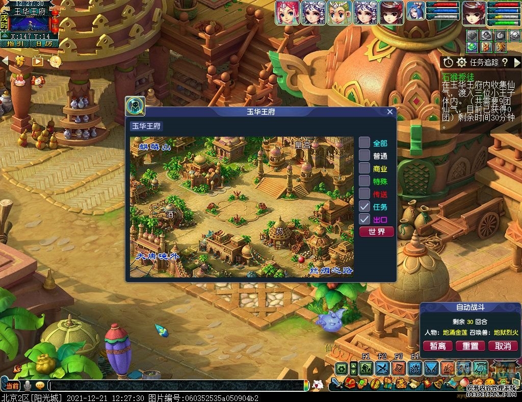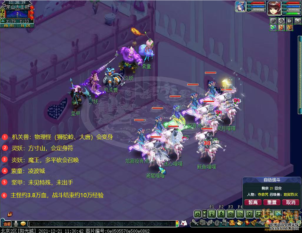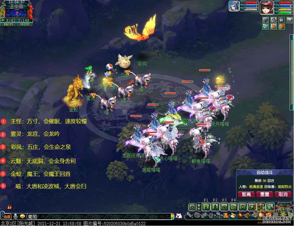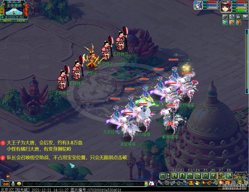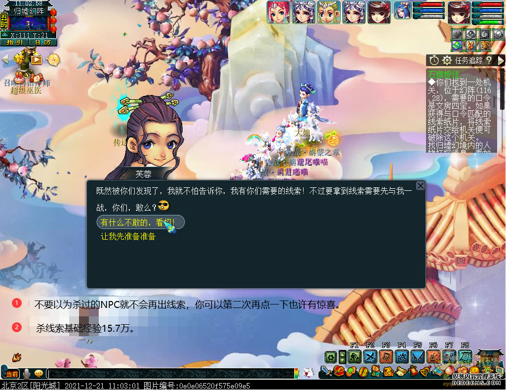 [h2]副本简介[/h2] 唐僧师徒一行来到玉华县,唐僧进宫与玉华王相谈甚欢,玉华王宣与唐僧师徒4人一起用斋,之后却麻烦不断。 我们需要前去玉华县,帮助唐僧师徒几人解决麻烦。悟空、八戒、沙僧三人顺利将玉华王的三个儿子收为徒弟,传授一身本事。 ![]() 副本说明: 1、此副本为双支线,开启后随机进入其中一条支线。任务时间为120分钟。 2、等级限制:≥60级 3、人数要求:5人 4、战斗死亡为正常死亡。 [h2]测试队伍[/h2] ![]() [h2]开启副本[/h2] ![]() 可以组好队在长安城(150,184)处找副本官员直接开启副本,创建成功后可以立即传送到副本场景。 进入后随机触发一条支线: [h2]支线一[/h2] ![]() 安抚受惊的王子后,进入地洞里找线索营救玉华王。 图上5个标识为5个传送门,点击传送门可随机传送到其他4个传送门外,方便更快捷地找线索。 ![]() ![]() 找到线索人的时候,需要与之一战,进入战斗只有两个怪,战斗胜利获得线索口令。 需要注意:所有NPC不止是只能找一次,获得线索和上交都会刷新NPC,所以可以同一个NPC再找第二次试一下。 ![]() 得到线索口令后,找到对应机关给予正确口令即可完成,可选择获得5个线索再交,也可选择获得一个交一个。 ![]() ![]() 找齐线索口令后,在任务栏所提示的位置找到地洞,点击进入继续追寻唐僧和玉华王的下落,来到了穿山大王府。 ![]() ![]() 木柜随机触发小事件,包括,空柜子、增加10点愤怒、变身蝙蝠或野猪(原来有变身的不覆盖)、蘑菇、遇到老鼠(战斗)等等,另外,开启2个木柜的时间间隔需≥5秒。 ![]() 大概破开一半木柜后,木柜会全部消失,此时可以上阁楼(50,50)找到穿山大王。 [h2]支线二[/h2] ![]() ![]() 前往玉华县分别带孙悟空、猪八戒和沙僧到玉华府与唐僧一同用膳,在进入玉华府后,注意不要碰上宫女,不然会触发战斗。 ![]() ![]() ![]() ![]() ![]() ![]() ![]() ![]() 从玉华府(5,4)处传送去玉华县采集蔬果,右击竹篮可以获知何处有蔬果,采集蔬果时可能会触发获得蘑菇、直接获得蔬果、回答问题或战斗。 ![]() ![]() ![]() ![]() 蔬果煮熟后,将食物分发给三位王子,触发三场战斗,战斗很简单,会有悟空、八戒和沙僧来助战。 三场战斗都有较大几率获得物品哦~ [h2]两个不同支线的汇总后续[/h2] ![]() ![]() ![]() 欣赏完一段小动画后,我们需要在场景里找到9个仙气,然后将其分发给3个王子再跟3个王子切磋切磋(这里大家可以使用蘑菇)。 [h2]决战[/h2] ![]() 副本至此结束。 总结:石猴授徒这个5人的普通副本,战斗难度不高,耗时半小时左右,物品奖励也不错。 时间较多的小伙伴可选择二刷,二刷切换点在找仙气那里,副本进行到找仙气就可以等失败了。 |