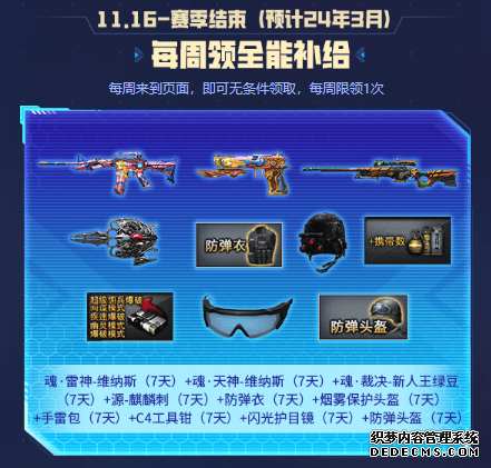 每周补给,全能礼包助力全新赛季! 每周来到页面,即可无条件领取补给礼包,每周限领1次;其中包含了全新源英雄级属性武器维纳斯系列、世界冠军联名狙击枪魂·裁决-新人王绿豆、英雄级战斗属性源·麒麟刺以及烟雾头、手雷包、C4钳子等爆破专属装备。各位CFer千万不要错过啦~