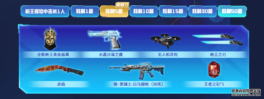 其中在排位中完成击杀一人并完整结束游戏可领取对应的M4A1-死神、鹰爪-枪王排位等奖励;累计胜场满足1~50局后,可依次领取到包含FR-F2-炫彩狙击枪、幻影双斧、限时发放的蝴蝶刀-枪王排位、英雄级武器HK417-朱雀等道具,当胜局达到50局后,即可领取到绝版头饰全能枪王黄金面具、稀有尼泊尔赤焰、稀有无人机背包、英雄级战斗属性御·黑骑士-白马银枪以及王者之石等众多好礼!