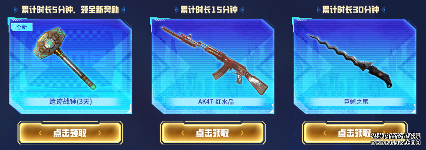 玩全新派对模式,解锁豪华大礼包! 玩全新地图-危境派对,游戏满5分钟、15分钟、30分钟和60分钟的对应奖励内容,累计玩派对模式5分钟,就能体验到新版本推出的遗迹战锤(近战武器);累计15分钟,领取AK47-红水晶;