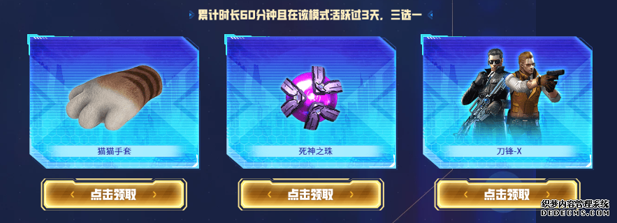 累计30分钟可得到皮肤版马来剑-巨蜥之尾;当累计时长60分钟且活跃3天后,还可以在跳跳乐强化武器猫猫手套、死神之珠和强化型经典角色刀锋-X中任选一件领取。