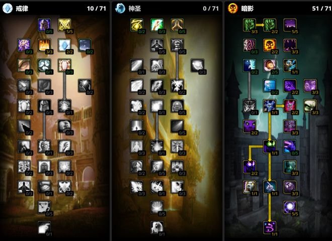 天赋:牧师做任务毫无疑问应该选择暗牧,放弃部分暗影增伤天赋点满戒律10点主要是为了后续能点出冥想加强续航。71级-79天赋顺序:冥想1-3级、强化心灵震爆3-5级、暗影能量1-3级。 雕文:暗影雕文(大)、消散雕文(大)、暗影魔雕文(小)、漂浮雕文(小)、坚韧雕文(小) 术士