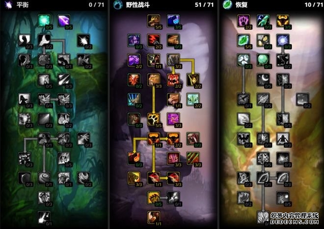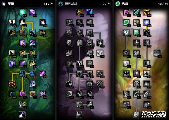 WLK平衡德很强大,完全可以作为练级主力天赋。71级-79天赋顺序:清晰预兆、变形大师1-2级、塞纳留斯之怒3-5级、星空专注2-3级、强化精灵之火第2级 雕文:星辰坠落雕文(大)、愤怒雕文(大)、荆棘雕文(小)、水栖形态雕文(小)、急奔雕文(小) 德鲁伊(野性)
