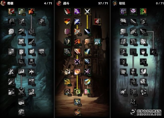 天赋:猫德效率比平衡要低一些。71级-79天赋顺序:清晰预兆、自然变形1-3级、变形大师1-2级、激怒4-5级、野性侵略第4级。 雕文:裂伤雕文(大)、狂暴雕文(大)、荆棘雕文(小)、水栖形态雕文(小)、急奔雕文(小) 盗贼