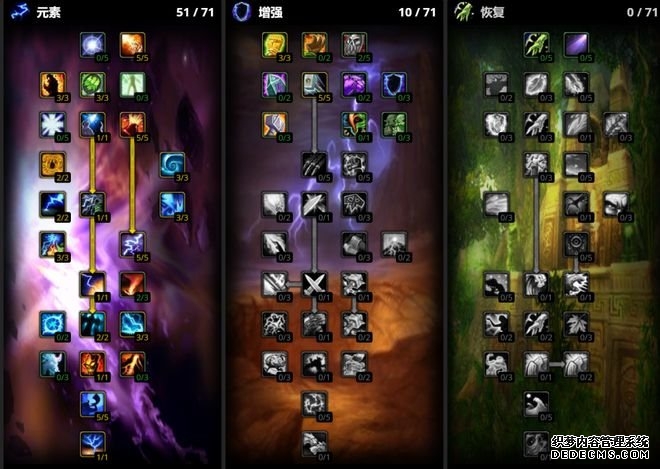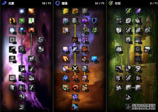 天赋:增强毫无疑问是萨满的最佳练级天赋,71-79级天赋顺序:元素集中、元素之怒1-5级、强化火焰新星1-2级、烈焰召唤第3级。 雕文:火舌武器雕文(大)、火焰新星雕文(大)、水之护盾雕文(小)、复生雕文(小) 萨满(元素)