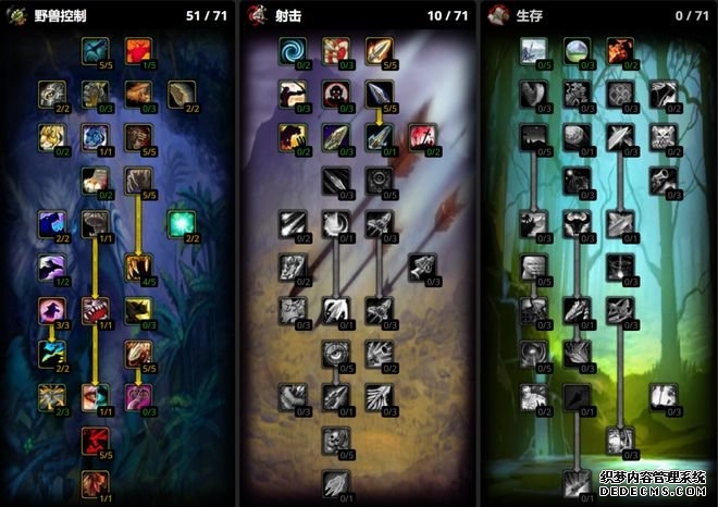 天赋:元素杀怪效率不错,缺点是续航跟不上需要坐地板。71-79级天赋顺序:萨满专注、元素武器1-3级、风暴、大地与火焰等级3、熔岩涌动1-3级、震耳回音等级1 雕文:火舌武器雕文(大)、天怒图腾雕文(大)、水之护盾雕文(小)、复生雕文(小) 猎人