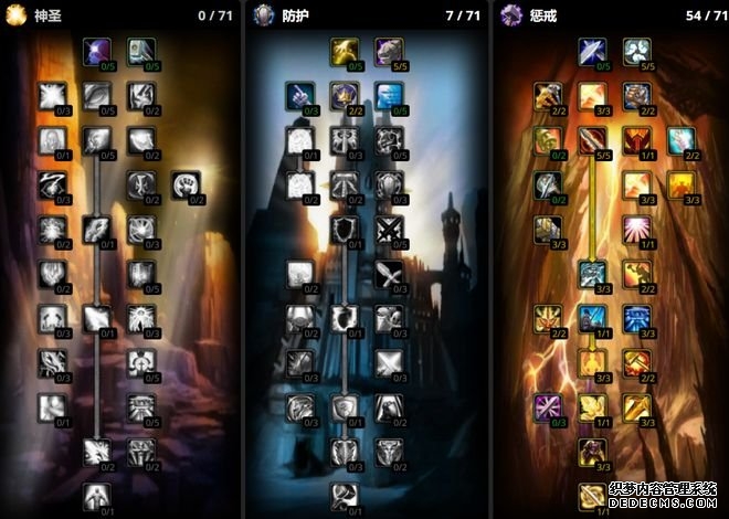 天赋:圣骑士推荐惩戒骑,71-79级天赋顺序:迅捷惩戒1-3级、辩护1-2级、淡薄1-3级、强化正义之怒等级1 雕文:驱邪雕文(大)、审判雕文(大)、圣疗雕文(小)、感知亡灵雕文(小) 死亡骑士