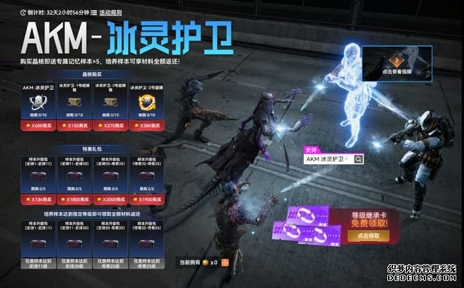 ►AKM 冰灵护卫 ◆ 活动时间: 2025年9月24日7点-2025年10月28日 23:59:59 ●活动规则: ◆活动期间,消耗拍卖币可兑换AKM晶核、超频、培养礼包 ◆活动结束后,晶核、超频将会以原价上架商城 ◆活动期间,提升该晶核任意记忆样本等级达到指定等级,可获得材料返还 ◆全新晶核等级继承系统上线福利,可在活动页面免费领取继承卡×1 ◆ 活动奖励: