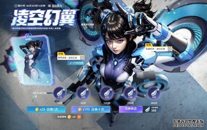 ►凌空幻翼 ◆ 活动时间: 2025年9月24日7点-2025年10月28日 23:59:59 ◆ 活动规则: ◆花费吉吉币×20可进行1次召唤,或花费吉吉币×195进行10次召唤 ◆进行召唤到达不同次数,可额外领取【幻翼徽章】 ◆每次召唤可得幻翼徽章*16~200,且均有机会直接获得角色皮肤凌空幻翼 或 传奇机甲凌空幻翼 ◆消耗幻翼徽章可在兑换商店中兑换指定物品,活动结束后,幻翼徽章将过期并失效,请及时使用 ◆ 活动奖励: