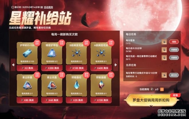 ►星耀补给站 ◆ 活动时间: 2025年7月16日7点-2025年8月19日 23:59:59 ●活动规则: ◆活动期间,完成任务可获得深渊罗盘:任务分为每日任务和无尽任务,每日任务每日0点刷新,无尽任务无刷新时间,可重复完成 ◆消耗深渊罗盘可在商城中兑换奖励。商城内的商品每周一刷新购买次数,请及时购买 ◆玩家可花费指定货币购买深渊罗盘(也可消耗1点券购买1深渊罗盘),每个档位有购买限制 ◆活动结束后,深渊罗盘会失效并清空,请玩家合理安排购买和消费计划 ◆ 活动奖励: