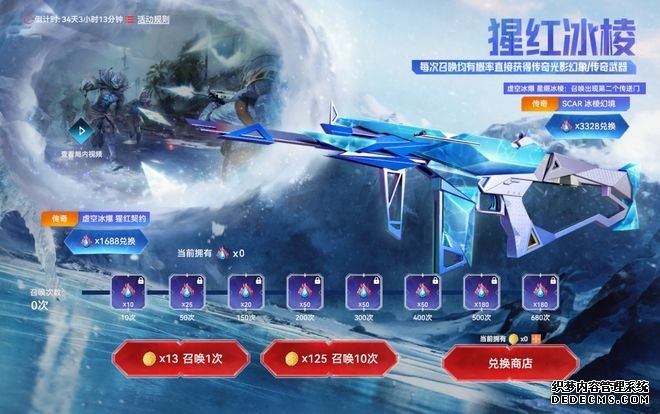 ►猩红冰棱 ◆ 活动时间: 2025年9月24日7点-2025年10月28日 23:59:59 ●活动规则: ◆花费吉吉币×13可进行1次召唤,或花费吉吉币×125进行10次召唤 ◆进行召唤到达不同次数,可额外领取冰火币 ◆每次召唤可得冰火币*1~100,传奇武器SCAR 冰棱幻境/传奇光影幻象 虚空冰爆 猩红契约 ◆前往本活动兑换商店,可选择消耗冰火币兑换指定奖励 ◆活动结束后,冰火币将失效并清空,请及时兑换 ◆ 活动奖励: