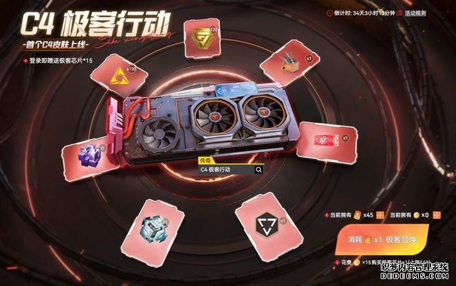 ►C4 极客行动 ◆ 活动时间: 2025年9月24日7点-2025年10月28日 23:59:59 ●活动规则: ◆活动期间,登录即赠送极客芯片*15,玩家可花费 吉吉币×15 兑换 极客芯片×1(最多可购买161张) ◆每次进行极客召唤,即可得到本活动页面上的1个奖励,奖励不会重复获得,获取全部外圈奖励后,必定获得内圈奖励 ◆每次召唤所需要的极客芯片数量不同,活动结束后,极客芯片将失效,请尽快使用 ◆ 活动奖励: