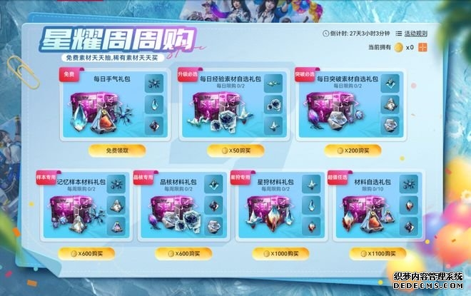 ►星耀周周购 ◆ 活动时间: 2025年9月24日7点-2025年10月28日 23:59:59 ●活动规则: ◆活动期间,玩家每日登录可抽取免费礼包一次 ◆活动期间,玩家可花费吉吉币购买对应的礼包 ◆材料自选礼包为活动期间内限购10次 ◆ 活动奖励: