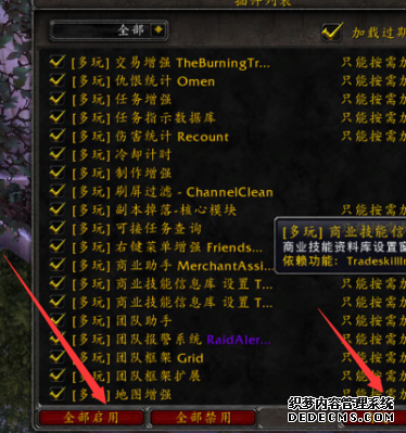 4.加载完所以可以插件之后点击下方的全部启用,然后点击确定。游戏会重新加载全部的插件信息,其中就包含伤害相关的插件。这个时候可以到外面杀只怪试试看是否有伤害信息;