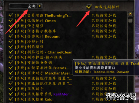 3.这时我们回到游戏的设置主菜单。点击插件,打开插件的配置信息界面。在插件配置信息界面点击选择全部插件,并且把加载过期插件全部选上。确保游戏加载了所有的插件;