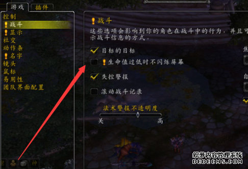 2. 在老版本中在该界面就可以设置战斗的相关信息,但是现在的版本只能设置目标的目标以及生命值过低时候是否闪烁屏幕等信息,并不能对伤害数值进行设置;